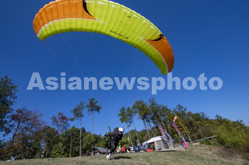图片说明:2023年11月20日,浙江省兰溪市女埠街道白露山滑翔伞训练基地,来自全国各地的滑翔伞运动员冲向起点,进行滑翔伞定点赛。