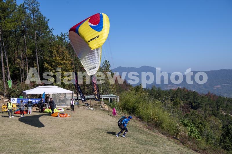 图片说明:2023年11月20日,浙江省兰溪市女埠街道白露山滑翔伞训练基地,来自全国各地的滑翔伞运动员冲向起点,进行滑翔伞定点赛。
