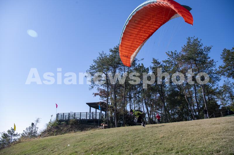 图片说明:2023年11月20日,浙江省兰溪市女埠街道白露山滑翔伞训练基地,来自全国各地的滑翔伞运动员冲向起点,进行滑翔伞定点赛。