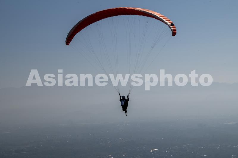 图片说明:2023年11月20日,浙江省兰溪市女埠街道白露山滑翔伞训练基地,来自全国各地的滑翔伞运动员在空中滑翔,进行滑翔伞定点赛。