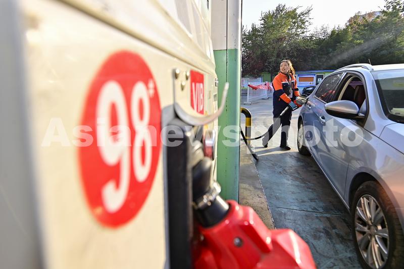 图片说明:2023年11月21日,山东省青州市一家加油站的工作人员给汽车加油。