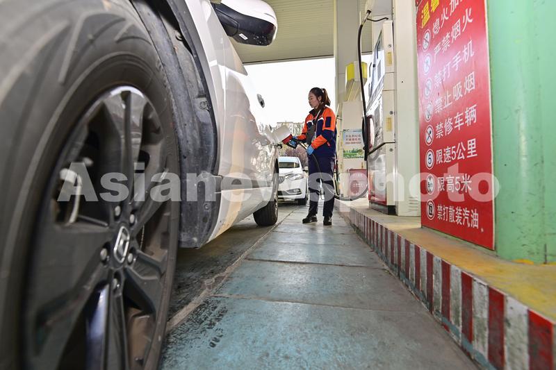 图片说明:2023年11月21日,山东省青州市一家加油站的工作人员给汽车加油。