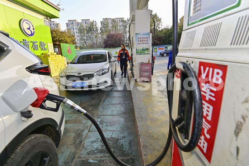 图片说明:2023年11月21日,山东省青州市一家加油站的工作人员给汽车加油。