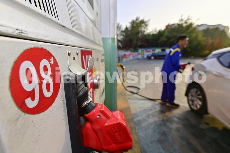 图片说明:2023年11月21日,山东省青州市一家加油站的工作人员给汽车加油。