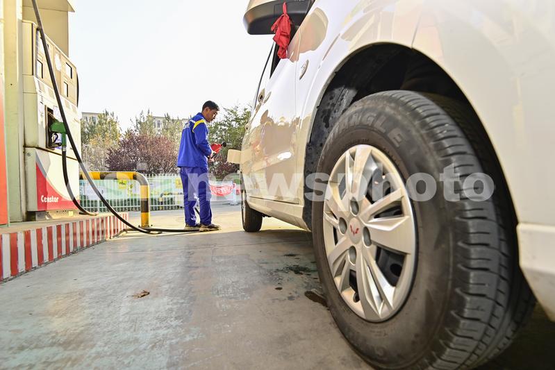 图片说明:2023年11月21日,山东省青州市一家加油站的工作人员给汽车加油。