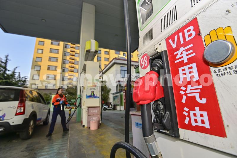 图片说明:2023年11月21日,山东省青州市一家加油站的工作人员给汽车加油。