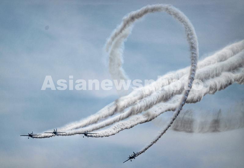 图片说明:来自欧洲的“穿越骑士”飞行表演队为在场观众带来精彩飞行表演。