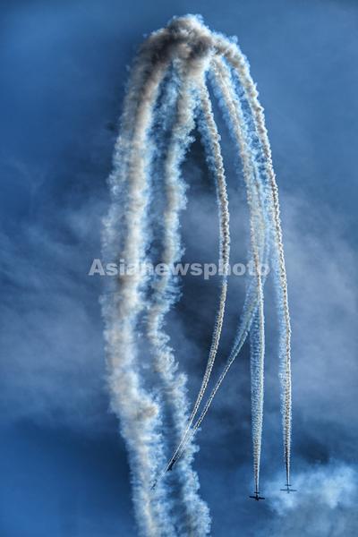 图片说明:来自欧洲的“穿越骑士”飞行表演队为在场观众带来精彩飞行表演。