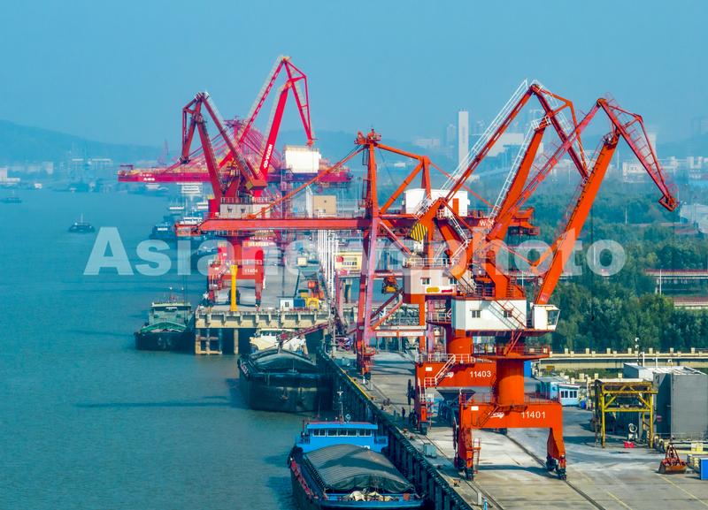 2023年11月27日,安徽省芜湖港朱家桥港区国际集装箱码头起重设备有序装卸作业,货车往来穿梭,一派繁忙景象。