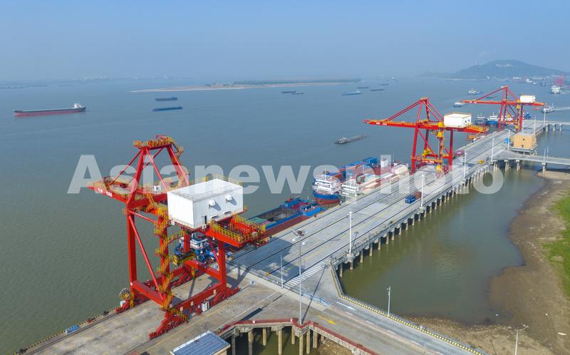 2023年11月27日,安徽省芜湖港朱家桥港区国际集装箱码头起重设备有序装卸作业,货车往来穿梭,一派繁忙景象。