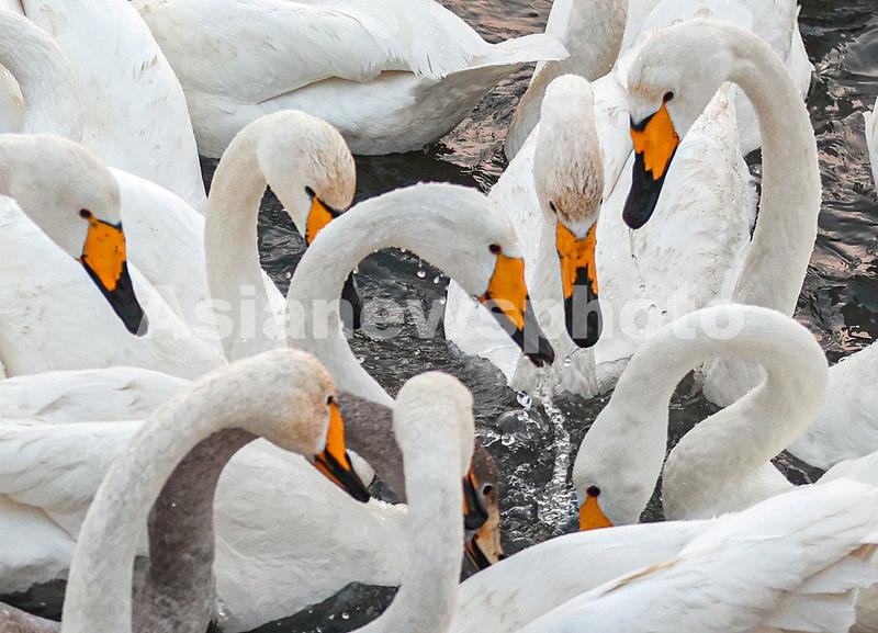 2023年11月29日,在山东省荣成大天鹅国家级自然保护区天鹅湖湿地,成群的大天鹅在饮水、觅食。