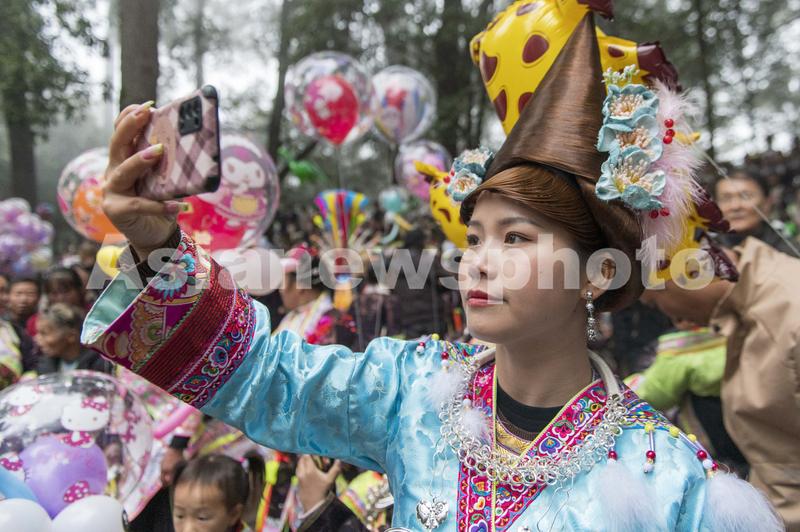 2023年12月2日,游客在贵州省从江县丙妹镇岜沙苗寨芦笙节上用手机自拍。