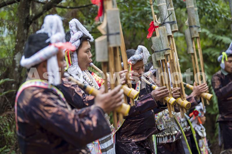 2023年12月2日,村民在贵州省从江县丙妹镇岜沙苗寨芦笙节上吹奏芦笙。