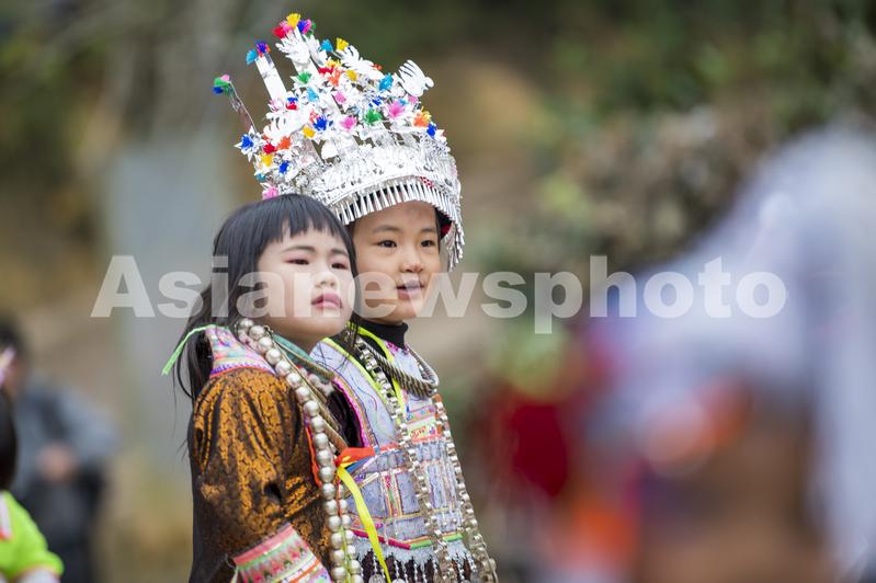 2023年12月2日,身着盛装的苗族小姑娘在贵州省从江县丙妹镇岜沙苗寨芦笙节上。