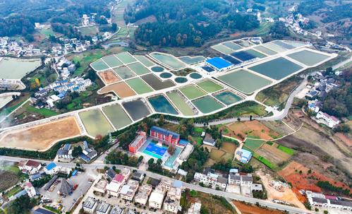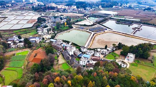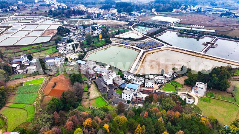 图片说明:2023年12月3日,贵州省铜仁市玉屏侗族自治县朱家场镇茅坡村,鱼苗孵化基地、色彩斑斓的森林、纵横交错的道路与错落有致的村庄相互映衬,犹如一幅美丽的冬日乡村画卷。