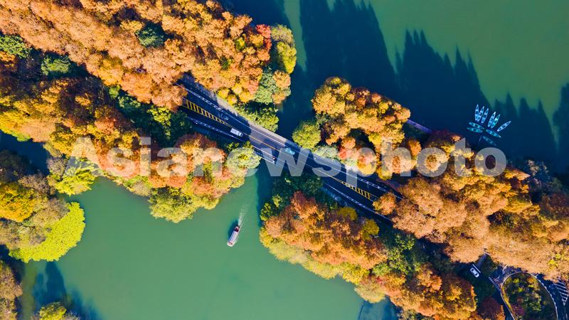 2023年12月5日,空中俯瞰杭州西湖杨公堤色彩斑斓美景如画。
