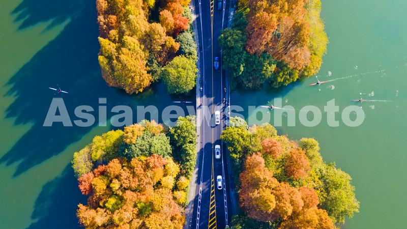 2023年12月5日,俯瞰杭州西湖杨公堤江两岸色彩斑斓,层林尽染,游客前乐享冬日美景,呈现出一幅美丽的生态画卷。
