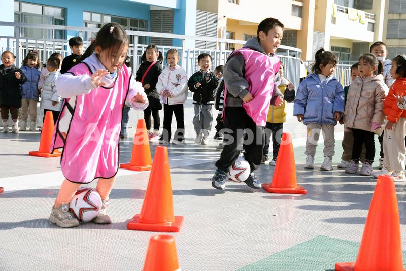 2023年12月7日,在浙江省湖州市德清县乾元镇第二幼儿园,孩子们玩足球游戏。