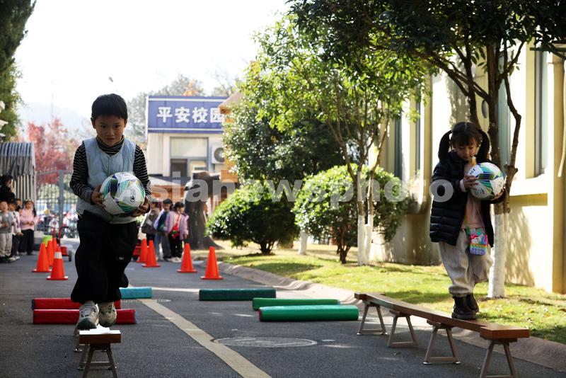 2023年12月7日,在浙江省湖州市德清县乾元镇第二幼儿园,孩子们玩足球游戏。