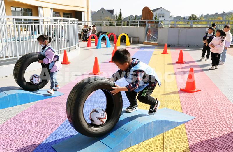 2023年12月7日,在浙江省湖州市德清县乾元镇第二幼儿园,孩子们玩足球游戏。
