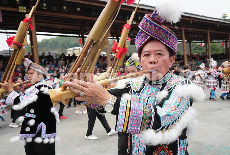 2023年12月9日,在广西柳州市融水苗族自治县梦呜苗寨景区,苗族群众为游客展示打同年仪式的芦笙吹奏表演。