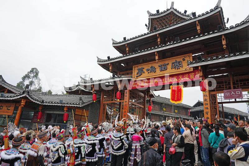 2023年12月9日,在广西柳州市融水苗族自治县梦呜苗寨景区,游客围观打同年进寨仪式。