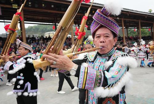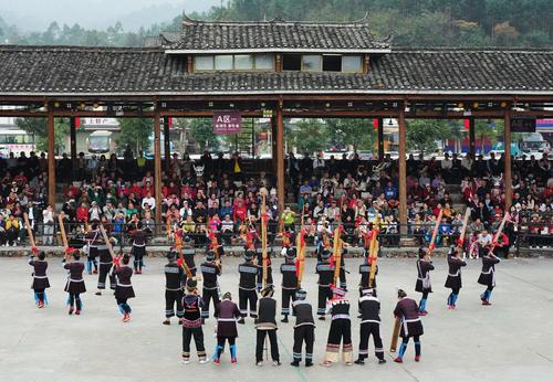 2023年12月9日,在广西柳州市融水苗族自治县梦呜苗寨景区,游客围观苗族群众表演高难度的芦笙舞。