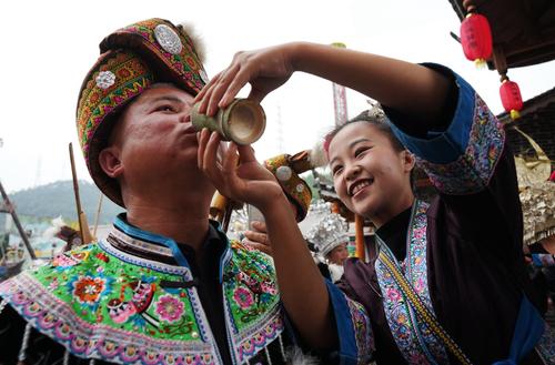 2023年12月9日,在广西柳州市融水苗族自治县梦呜苗寨景区,一位身着苗族服饰的游客(左)体验喝打同年进寨酒。