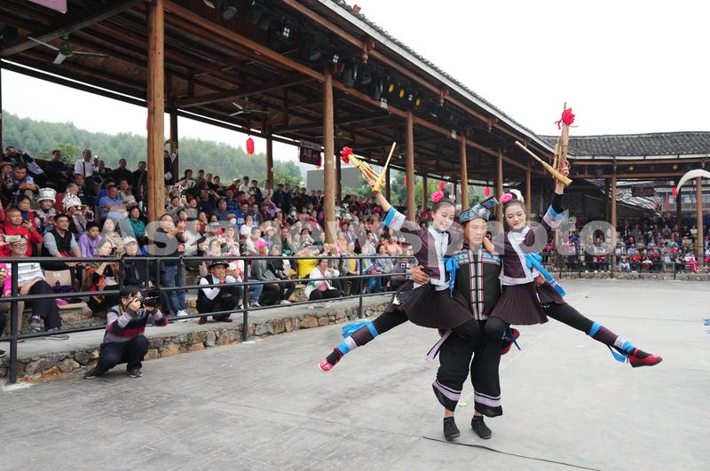 2023年12月9日,在广西柳州市融水苗族自治县梦呜苗寨景区,游客围观苗族群众表演高难度的芦笙舞。