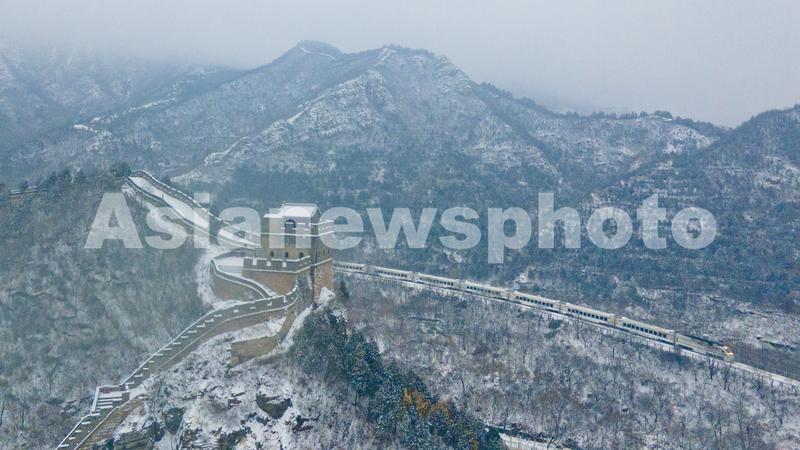 2023年12月11日,雄伟的居庸关长城与现代动车组列车遥相呼应,美轮美奂。