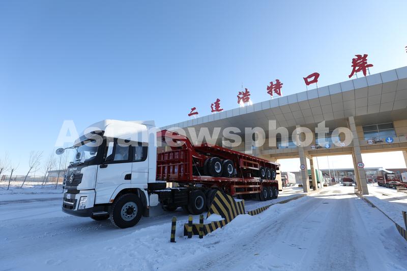 图片说明:2023年12月16日,出口商品车从二连浩特公路口岸快速通关。