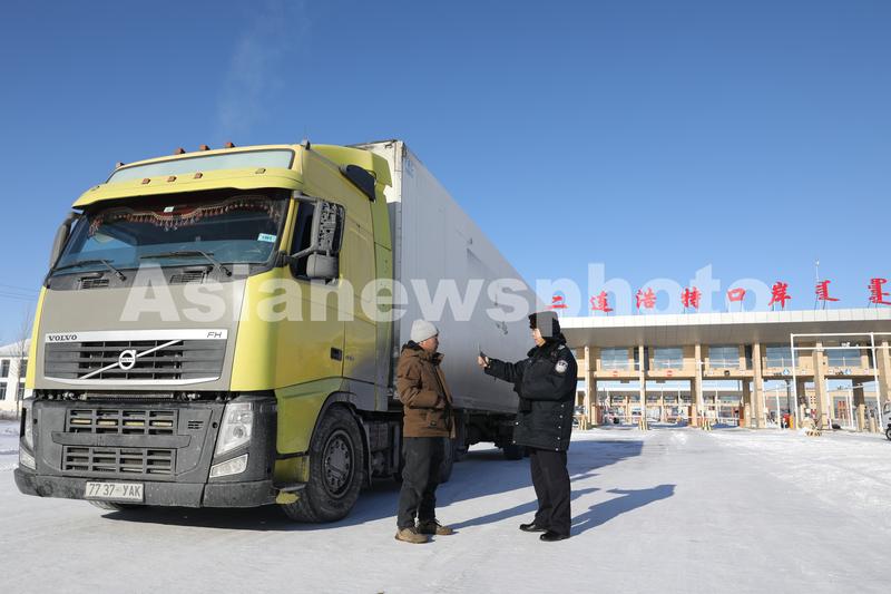 图片说明:2023年12月16日,二连出入境边防检查站执勤民警查验货车司机通关证件。