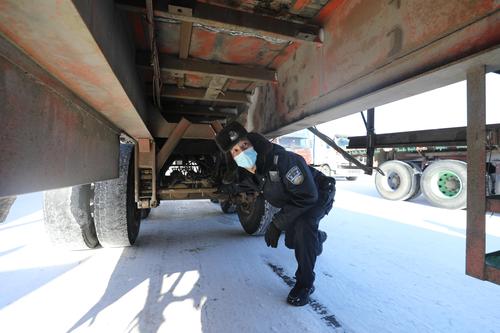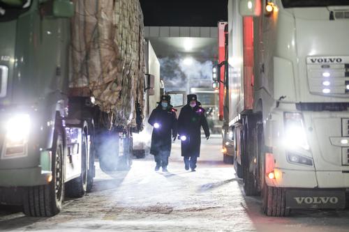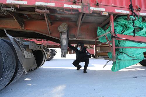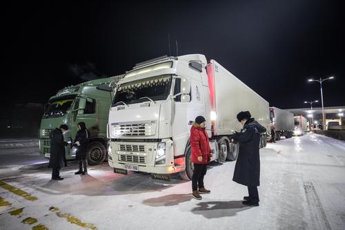图片说明:2023年12月16日,二连出入境边防检查站执勤民警查验货车司机通关证件。
