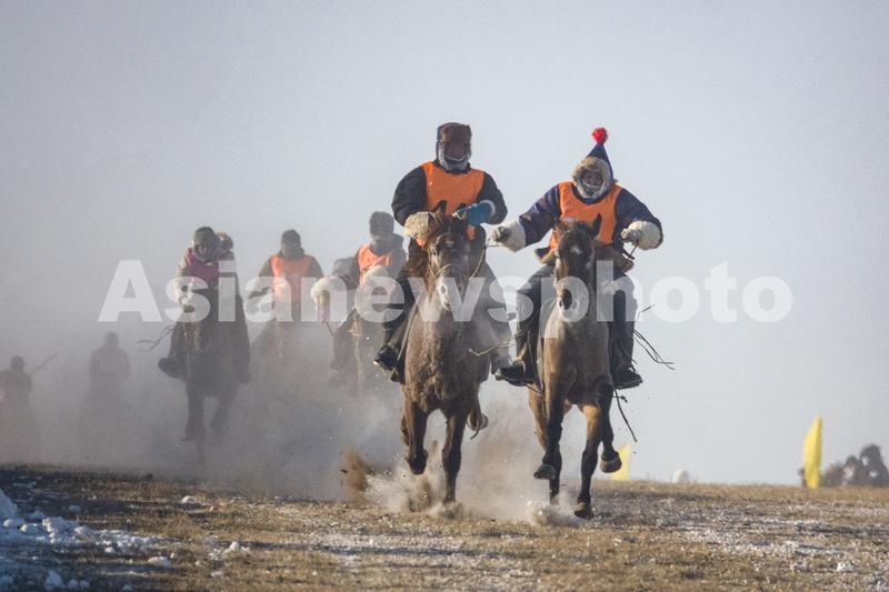 12月17日,牧民在冰雪那达慕现场进行蒙古马竞速赛。