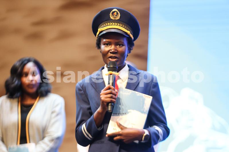 12月14日,中肯建交60周年招待会现场,肯尼亚标轨铁路女机车司机肯西莉亚分享她的成长故事。
