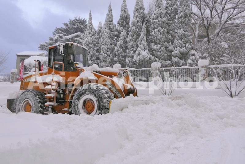 2023年12月21日, 大型机械在山东烟台街头清理道路积雪。