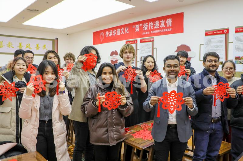 图片说明:2023年12月23日,在山东省滕州市博物馆非遗传承基地,外国学生展示中国剪纸。