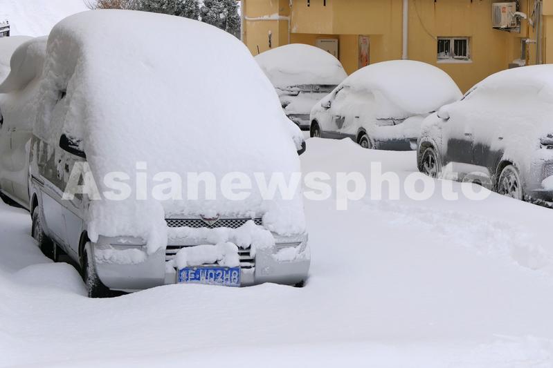2023年12月21日,在山东烟台街头,大量积雪覆盖车辆和道路。