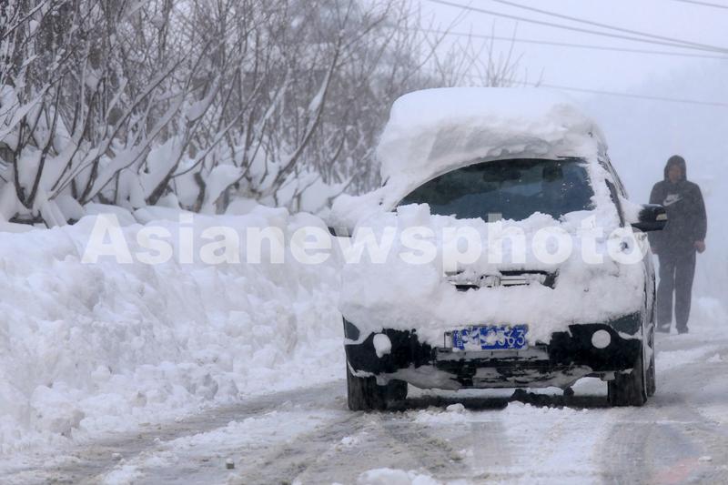 2023年12月21日,在山东烟台街头,大量积雪覆盖车辆和道路。