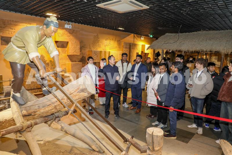 图片说明:2023年12月23日,在山东省滕州市鲁班纪念馆,外国学生观看鲁班锯的锯木演示。