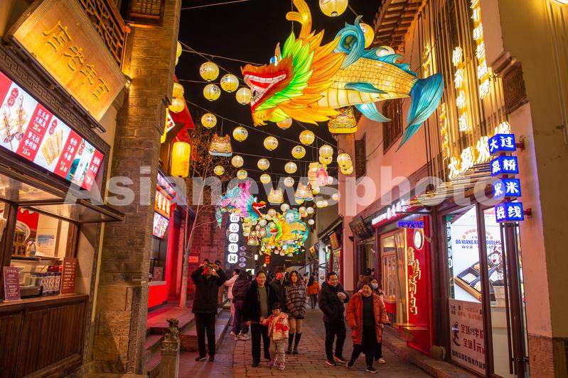 图片说明:2023年12月27日,游客在江苏省南京市老门东文化历史街区观赏花灯。