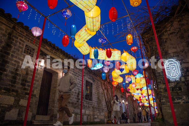 图片说明:2023年12月27日,游客在江苏省南京市老门东文化历史街区观赏花灯。