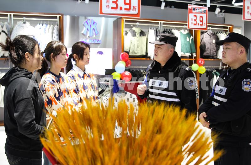 图片说明:2023年12月31日,山东省临沂市郯城县公安局东关派出所民辅警向鲁商城市广场商户宣讲安全常识。