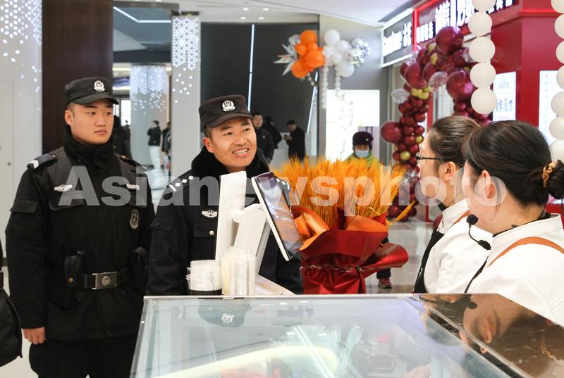 图片说明:2023年12月31日,山东省临沂市郯城县公安局东关派出所民辅警向鲁商城市广场商户宣讲安全常识。