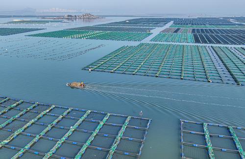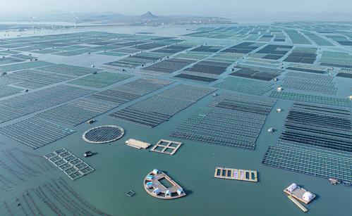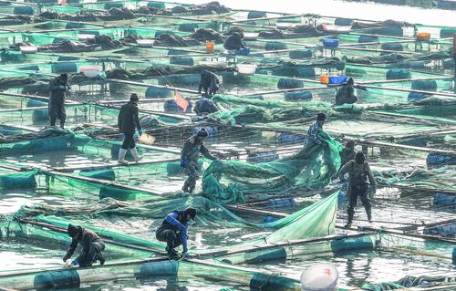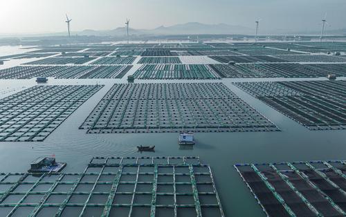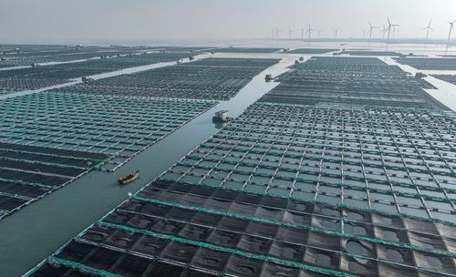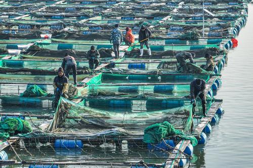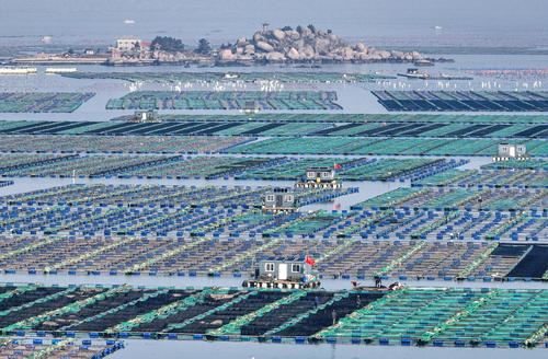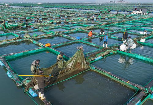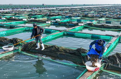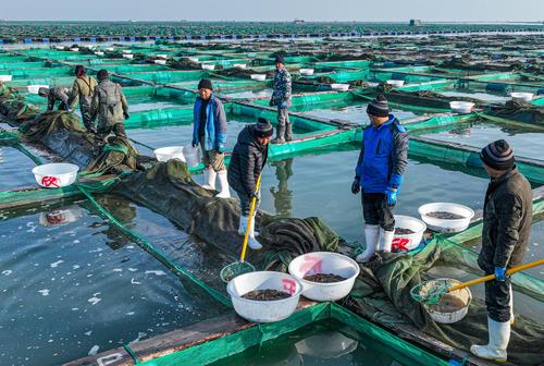 2024年1月2日,在山东省荣成市石岛管理区桑沟湾海洋牧场筏式生态养殖区内,养殖工人在收获海参。荣成市是全国海参养殖加工标准化示范区,荣成海参是全国农产品地理标志产品。目前,荣成市海参养殖面积约22万亩,年产鲜参3.3万吨,约占全国的16%,年产值63亿元。
