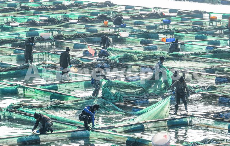 2024年1月2日,在山东省荣成市石岛管理区桑沟湾海洋牧场筏式生态养殖区内,养殖工人在收获海参。