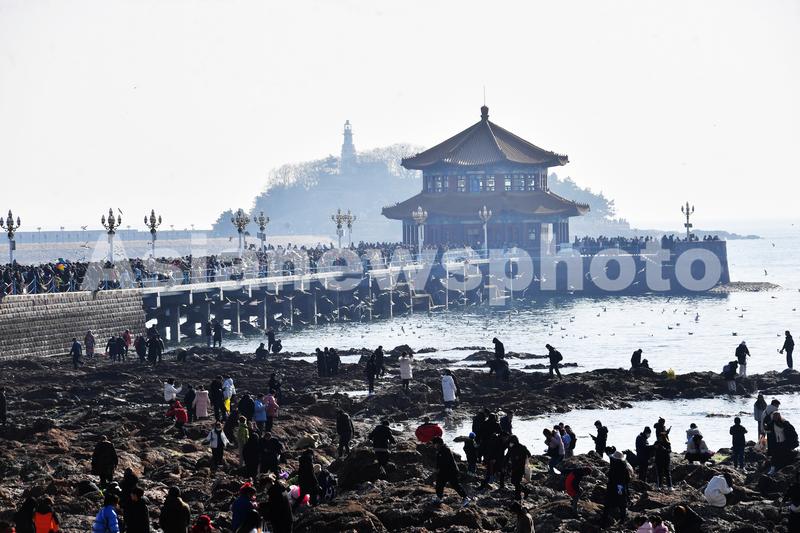 图片说明:2024年1月1日,在山东省青岛市市南栈桥景区,众多游客在回澜阁上喂食海鸥。