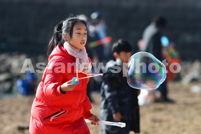 图片说明:2024年1月1日,在山东省青岛市市南栈桥景区,一名小朋友在海滩玩泡泡水游戏。
