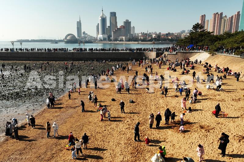 图片说明:2024年1月1日,在山东省青岛市市南栈桥景区,游客在海滩上休闲游玩。
