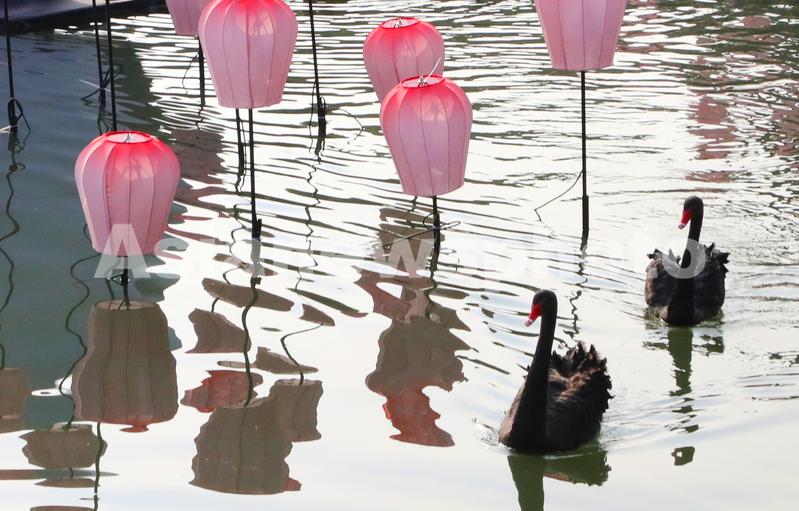 2024年1月2日,虽受新年伊始冷空气影响的古城苏州寒气袭人,但午后晴日暖阳下的该市盘门景区放生河塘内,一只只黑天鹅、大白鹅在装点新年喜气的一盏盏“孔明灯”中往返穿梭,戏水游弋,美如画景。
